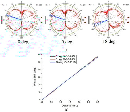 A supplementary analysis was performed at the end of the study, with the objective of studying the changes resulting from the off-boresight measurements for the high gain (Yagi) antenna. As shown in Figure 13a, the 3D radiation pattern (the gain is in linear scale) is generally dependent on the target rotative position in relation to the antenna plane, and the radiation lobes may suffer changes in the amplitude and position in space when the configuration suffers rotations. The distance between the target and the antenna was maintained at 500 mm. We assessed the effect of rotating the antennas from 0 to 5 and 18 degrees around the target. The rotation effect on the polar radiation pattern change in these three situations is indicated in Figure 13b. Finally, the effect on the S21 phase shift for the three rotations is shown in Figure 13c. The far-field condition and the (2.05–3.38) dBi gain range inspected ensure a very low impact from the off-boresight simulations on the phase shift results of the Doppler radar configuration.