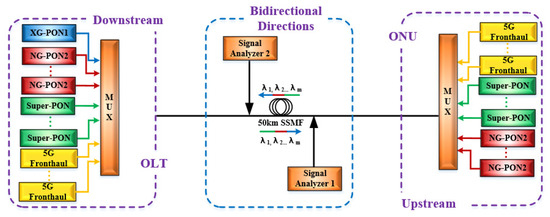 In order to evaluate the effects of SRS on 5G fronthaul networks based on WDM-PON in the C-band, VPI transmission Maker simulation systems have been installed. Note that, in order to accurately acquire the effect of SRS non-linearity impairment on the 5G fronthaul networks, the Kerr effects shall be ignored. Figure 1 shows the most severe scenario when NG-PON2 and Super-PON (16 channels per direction [25]), and XG-PON1 (189.6 THz in the downstream direction), coexist with the upstream and downstream wavelengths of the 5G fronthaul networks, which is described as an example. The used parameters are given in Table 2. At the transmitter sides, 12 wavelengths working at 197.4 THz, 197.5 THz, 197.6 THz, 197.7 THz, 197.8 THz, 197.9 THz, 198 THz, 198.1 THz, 198.2 THz, 198.3 THz, 198.4 THz, and 198.5 THz are employed as the upstream optical carriers of the 5G fronthaul, whose channel spacing is 100 GHz. Meanwhile, 12 wavelengths operating at 184.6 THz, 184.7 THz, 184.8 THz, 184.9 THz, 185 THz, 185.1 THz, 185.2 THz, 185.3 THz, 185.4 THz, 185.5 THz, 185.6 THz and 185.7 THz are used as the downstream optical carriers of the 5G fronthaul, where the channel spacing is also 100 GHz. According to the 25G enhanced Common Public Radio Interface (eCPRI) in 5G fronthaul networks [26], 25 Gb/s NRZ, ODB and PAM4 signals are modulated on the upstream and downstream wavelengths through the use of Mach–Zehnder Modulators (MZMs) with a fixed chirp coefficient of 0 [27]. Considering the increasing demands for bandwidth, the transmission rate of 50 Gb/s is also taken into account [28]. The wavelengths are then amplified to 8 dBm per channel. After amplification, the upstream and downstream wavelengths of different protocols are coupled together by multiplexers (MUXs) with an insertion loss of 1.5 dB. For the optical fiber length, the typical 5G fronthaul and PON distances are 10 km and 20 km, respectively [29,30]. However, since the Super-PON protocol specifies an optical fiber length of 50 km [25], the coupled signal is transmitted over a 50-km optical fiber for bi-directional transmission, with an attenuation of 0.24 dB/km and chromatic dispersion of 16 ps/(nm∙km). Following the optical fiber transmission, the upstream and downstream wavelengths are directed into the “Signal Analyzers” modules. Note that the “Signal Analyzers” modules are also used to measure the power prior to the optical fiber transmission.
