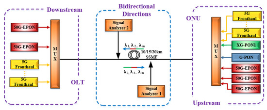 Simulation setup for measuring the SRS effect on the upstream and downstream wavelengths of the 5G fronthaul networks when NG-PON2, Super-PON, and XG-PON1 coexist with the 5G fronthaul upstream and downstream wavelengths.