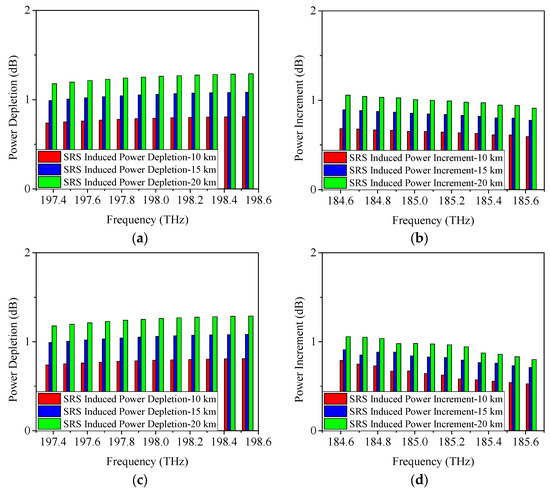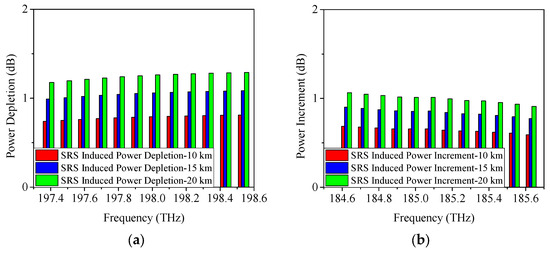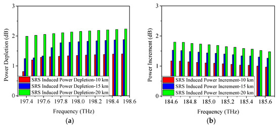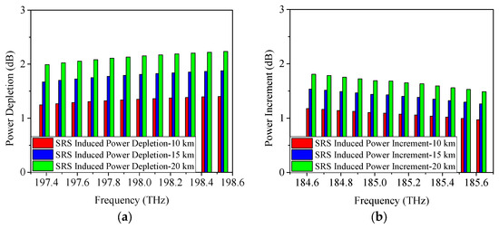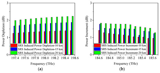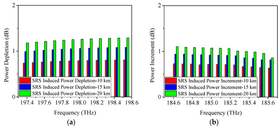 Subsequently, Figure 7 illustrates the SRS-induced power changes when the 5G fronthaul wavelengths (25 Gb/s NRZ signals) are transmitted simultaneously with NG-PON2 in the optical fiber. It can be seen that, with the increase of the transmitted wavelengths, the SRS non-linearity impairment becomes more severe as indicated in Figure 7a. The SRS-induced power depletion on Channel 12 (198.5 THz) is measured as 1.4 dB when the transmission distance is 10 km, which is 0.6 dB higher than that of the transmission case of only 5G fronthaul upstream and downstream wavelengths. More severely, when the transmission distance extends to 20 km, a 2.2-dB power depletion is caused by SRS non-linearity impairment, which is 0.9 dB higher than that of the transmission case of only 5G fronthaul upstream and downstream wavelengths. It is consistent with the conclusions obtained from the theoretical analysis (Section 2), i.e., the SRS-induced power depletion is related to the number of channels.