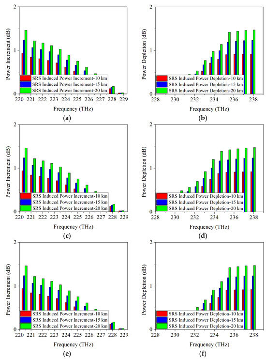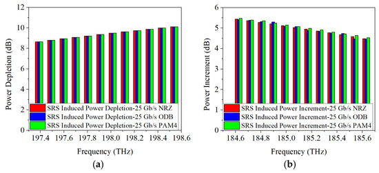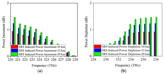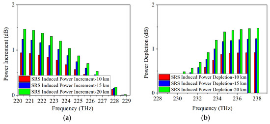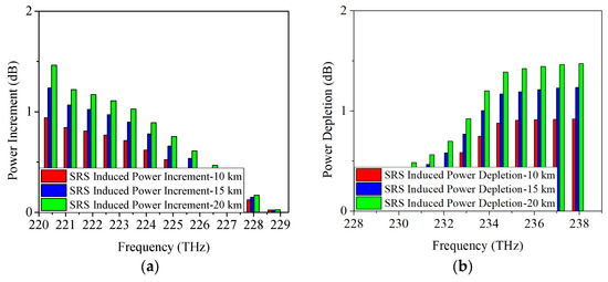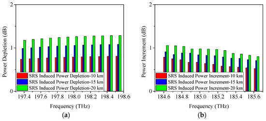 When the modulation format is 25 Gb/s ODB, the obtained power changes caused by SRS are given in Figure 4. From Figure 4a, it is shown that when the transmission distance is 10 km, the power depletion occurred on Channel 12 is measured as 0.8 dB, which is similar to the result of 25 Gb/s NRZ. Moreover, the SRS-induced power depletion is 1.1 dB/1.3 dB when the transmission distance is 15 km/20 km, which is also similar to the above-mentioned result of 25 Gb/s NRZ. Figure 4b demonstrates the SRS-induced power increment when the modulation format is 25 Gb/s ODB. It can be seen that, under the conditions of 10 km, 15 km, and 20 km link length, the SRS-induced power increments are 0.7 dB, 0.9 dB, and 1.1 dB, respectively.