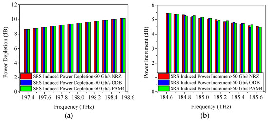 When boosting the single wavelength rate to 50 Gb/s, the obtained power changes caused by SRS are illustrated in Figure 10. According to the previously obtained conclusion, the power penalty caused by SRS non-linearity impairment is not significantly related to the modulation formats and modulation rates, i.e., the power penalty induced by SRS non-linearity impairment for 50 Gb/s NRZ, ODB, and PAM4 modulation formats should be 1.4 dB, 1.9 dB, and 2.2 dB, respectively, which is indeed the case with the results obtained from the simulations (shown in Figure 10).