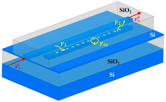 As shown in Figure 1, the silicon PCNC and the bus waveguides are etched on the SOI platform, with an etching depth of 220 nm. The optical field propagation process in the structure of a single arm coupled with a PCNC is also illustrated. The optical wave first enters the left side of the bus waveguide, and then its corresponding resonant component is coupled into the nanobeam cavity and later reversely coupled from the cavity to the bus waveguide. Finally, the total optical signal goes out from the right port of the bus waveguide. Thus, according to the temporal coupled-mode theory [27], the transfer function T(ω) of the coupling structure is expressed as follows [28]: