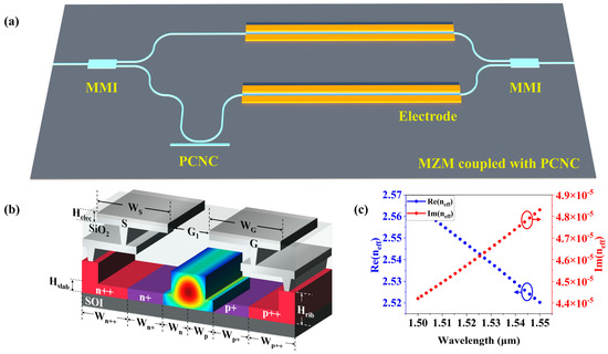 Structure of MZM with a single arm coupled with a PCNC. (a) Schematic diagram of MZM with PCNC. (b) Cross-sectional view of MZM and optical waveguide mode. (c) Variations in effective refractive index with wavelength.