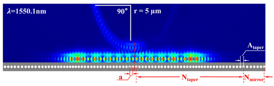 As illustrated in Figure 3, the structure of the two-dimensional PCNC is centrosymmetric, which consists of two tapers in the middle region and two mirrors at the left and right sides of the nanobeam cavity, respectively. The red part represents the strongest optical intensity distribution in the PCNC waveguide, and the hole radii of both tapers and mirrors of the PCNC are selected as 90 nm. In our PCNC, the duty cycle of a lattice can be expressed as f = πr2/(ac), where a is the lattice constant, and c represents the waveguide width of the nanobeam cavity. In the taper region, the number of the asymptotic holes Ntaper is 40, and the distance between the adjacent holes increases gradually from the center to both sides, which varies according to the following formula: ai = a − (i − 1)2(a − Ataper)/(Ntaper − 1)2, (i increases from 1 to Ntaper) [32]. The lattice constant a of the hole in the center is 0.3 µm, and the maximum lattice constant of the asymptotic region Ataper is 0.43 µm, which makes the light obtain a Gaussian mirror image at the center of the nanobeam cavity. The number of the mirror holes Nmirror is five, and the lattice constant of the mirror holes Amirror is equal to Ataper, which allows for the formation of an efficient reflective region to enhance the light confinement, as well as improves the light transmission to obtain a high quality-factor (Q-factor). In addition, the coupling gap between the bus waveguide and the PCNC is 0.18 µm. The approach of introducing the discrete states by changing the lattice constant while using holes with the same radius (90 nm), rather than gradually varying radii or using radii smaller than 90 nm, is notable. Also, it was noted that the discrete states, the intrinsic properties created by the PCNC, can interfere with the continuous state of the other arm of the MZM, which generates a Fano resonance. The more superior the performance of the discrete states in the PCNC, the higher the ER is.