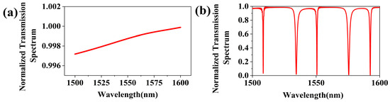 Furthermore, the performance of the PCNC is investigated by numerical simulations. A comparison of the normalized transmission spectra between the straight waveguide and the PCNC is shown in Figure 4a,b. The width of the straight waveguide is 0.45 µm, and the width of the PCNC and the bus waveguide are both 0.45 µm. Additionally, the coupling length Lcoupling between the PCNC and the bus waveguide is 1 µm, along with a = 0.3 µm, Ataper = 0.43 µm, gap = 0.18 µm, Ntaper = 40, and Nmirror = 5. In Figure 4b, it can be seen that there are discrete states produced in the nanobeam cavity, and the resonant wavelength such as 1550.68 nm is coupled into the nanobeam cavity.
