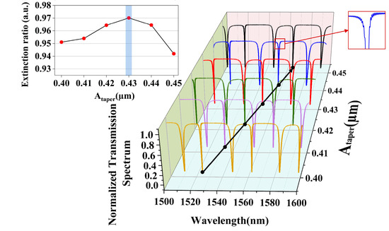 In this section, the influence of the structural parameters on the performance of the PCNC is numerically simulated after the component design. In order to achieve a high Q-factor, the FDTD model is utilized to analyze the optimal values of Ataper, Ntaper, Nmirror, and gap. Initially, the PCNC is engineered on a standard SOI substrate. The single-mode light enters from the upper left port of the bus waveguide and exits from the upper right port. Upon completion of the structural setup, keeping the other parameters constant (gap = 0.18 μm, Ntaper = 40, and Nmirror = 5), the value of Ataper is gradually varied from 0.40 μm to 0.44 μm. The resulting variations in the normalized transmission spectra and the corresponding ER obtained by numerical simulation are presented in Figure 5 and its inset, respectively. The spectra illustrated by the different colored lines represent different Ataper. It can be seen that with the increase in Ataper, the spectra are gradually red-shifted, and the black line in Figure 5 illustrates this wavelength shift trend. At the same time, the spectral position of a resonant wavelength of 1550.68 nm can be obtained with Ataper = 0.43 µm. Furthermore, the length of the taper region also increases along with the increase in Ataper.