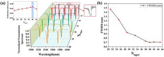 (a) Variations in transmission spectra and ER for PCNC with Ntaper. (b) Relationship between FWHM and Ntaper.
