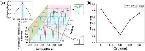 Furthermore, the coupling gap between the nanobeam cavity and the bus waveguide can significantly affect the component performance, which is initially iterated from 0.1 µm to 0.26 µm. As shown in Figure 7a, the variations in the normalized transmission spectra as illustrated by the different colored lines represent the relationships with different coupling gaps, and the corresponding ERs are demonstrated by their respective calculations. Obviously, the coupling effects and the spatial distribution of the optical energy can be remarkably affected by the coupling gap between the bus waveguide and the cavity. Also, variations in the FWHM with the different gaps are shown in Figure 7b, where the performance of the FWHM initially improves and then deteriorates after the gap of 0.18 μm. When the coupling gap increases from a distance of zero, the optical signal will sequentially experience the over-coupled (gap < 0.1 μm), critically coupled (0.1 μm < gap < 0.22 μm), and under-coupled (gap ≥ 0.22 μm) states, which can determine the optical waveguide mode coupled from the bus waveguide to the cavity at a specific resonant wavelength. When the gap is ultra narrow, the discrete states do not appear in the spectrum due to the over-coupled state. With the increase in the gap, the discrete states gradually occur. Yet, the spectrum near the discrete states possesses asymmetry, with very low optical power on one side. When the gap is between 0.1 μm and 0.22 μm, the critically coupled state is generated, and the discrete states in the spectrum show a superior performance in optical intensity confinement. However, when the gap exceeds 0.22 μm, the discrete states gradually disappear. When critical coupling is achieved, the optical wave transiting the bus waveguide is maximally coupled to the PCNC if the input signal oscillates at its resonant wavelength. Therefore, after simulation verification and optimization, the optimal performance such as the minimum coupling loss, Q-factor = 2.247 × 103, and ER = 0.97 for the PCNC component can be obtained at a resonant wavelength of 1550.68 nm, when gap = 0.18 µm and Lcoupling = 1 µm. Thanks to our coupling gap not being ultra narrow, extra fabrication difficulties are avoided.