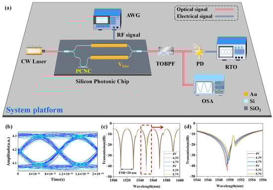 Overall, as illustrated in the schematic diagram of Figure 8a, a comprehensive platform consisting of a silicon photonic chip and discrete components is numerically simulated in Ansys Lumerical INTERCONNECT (2022 R2) to demonstrate the system performance. Firstly, the system link is constructed in the simulation software, as illustrated in Figure 8a. The performance of the PCNC, which is of importance to the system operation, can be directly characterized using the Optical N-port S-parameter element (SPAR) in Ansys Lumerical INTERCONNECT. Also, the S-parameters of the PCNC are imported into this element, and then the SPAR is connected to one arm of the MZM using a waveguide. The optical signal with a power of 10 mW and a central wavelength of 1550.68 nm from a CW laser transmits into the silicon photonic chip, which is our MZM design based on a single arm coupled with a PCNC, and the NRZ-OOK signal Vt at the bit rate of 10 Gbit/s generated from an arbitrary waveform generator (AWG) and the bias voltage Vbias are connected to the electrical input ports of the MZM, respectively. Here, the output optical signal from the silicon chip design is finely filtered by a tunable optical band pass filter (TOBPF) that is used to reduce the out-of-band noise, as well as improve the out-of-band rejection ratio and the optical signal to noise ratio (OSNR). The central wavelength of the TOBPF is set to 1550.68 nm, with a filtering bandwidth of 0.8 nm. The spectrum of this optical signal after the TOBPF is observed by an optical spectrum analyzer (OSA) to analyze and adjust the performance of this optical filtering.