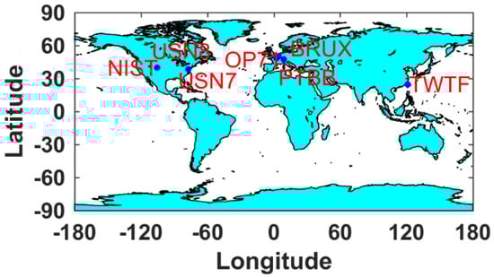 Seven GNSS stations, each equipped with an H-master clock, were selected for this study and are listed in Table 1. Their geographical distribution is depicted in Figure 1. The PTBB station serves as the central node. The observational data were collected over a 22-day period, ranging from DOY (Day of year) 165 to 187 in 2023. The precise orbit and clock products will be derived by integrating the broadcast ephemeris with the Galileo HAS corrections. The IGS final products were obtained by downloading from the ftp server at ftp://igs.gnsswhu.cn/ (from DOY 165 to187 in 2023, accessed on 13 April 2025). The GPS PPP time transfer solutions, derived from IGS final products using a static model, are established as the benchmark reference.