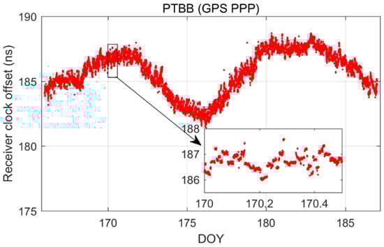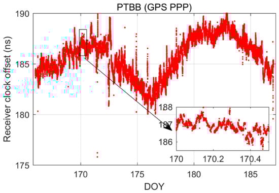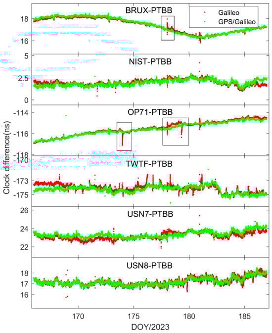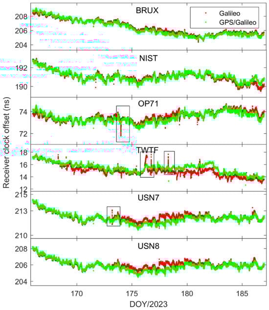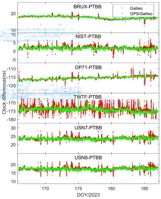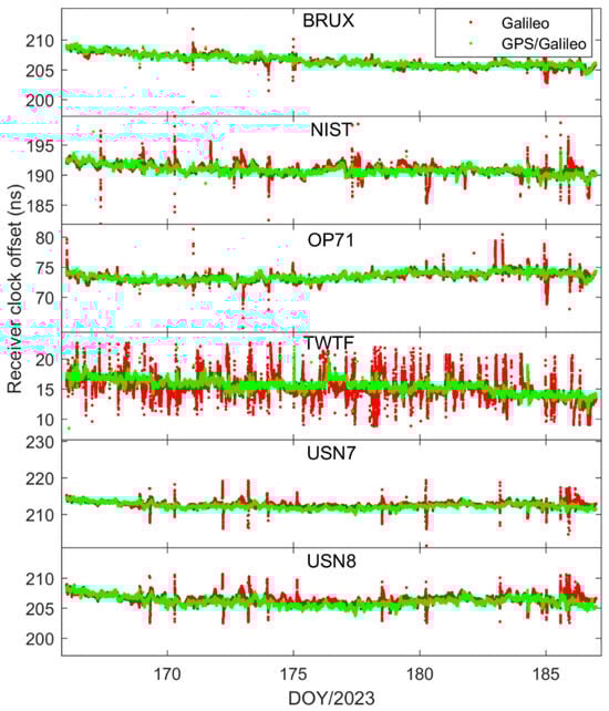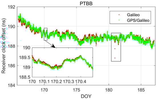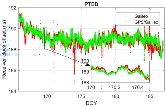 In order to delve deeper into the performance of single-constellation Galileo and combined Galileo/GPS PPP time transfer in static mode, Figure 5 depicts the receiver clock offsets at the PTBB station derived from single-constellation Galileo and Galileo/GPS combined PPP solutions in static mode. Furthermore, Figure 6 supplements this analysis by displaying the receiver clock offsets for six other stations, also determined under static mode conditions using single-constellation Galileo and Galileo/GPS integrated PPP calculations.