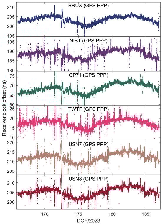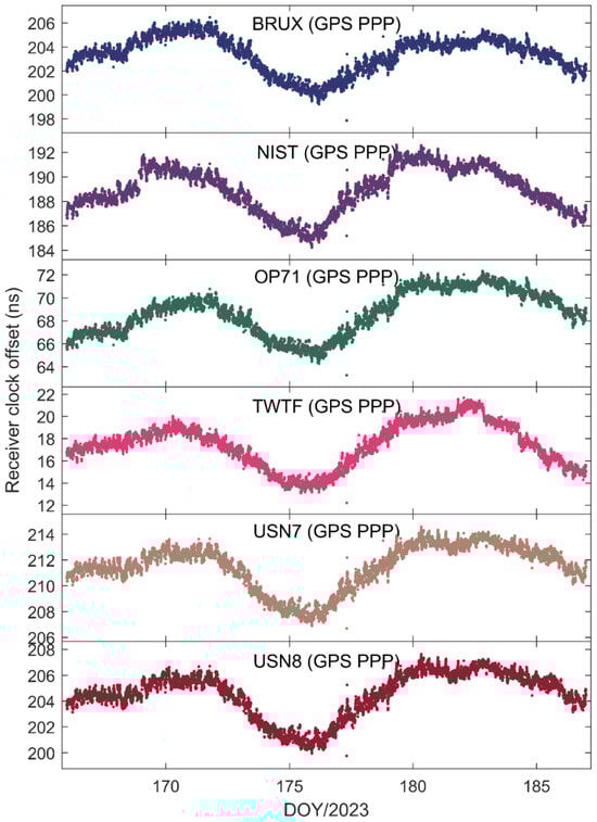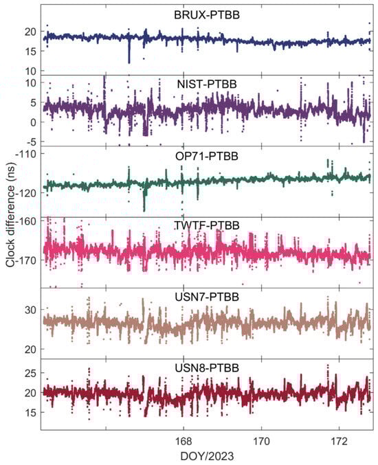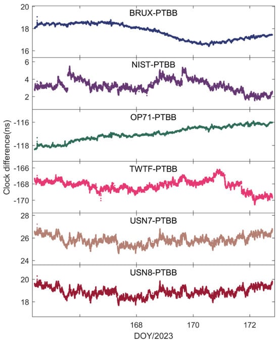 To further explore the performance of kinematic PPP time transfer based on the Galileo HAS service, Figure 10 presents the receiver clock offsets for the PTBB station calculated using GPS PPP in dynamic mode, while Figure 11 illustrates the receiver clock offsets for six other stations derived from GPS PPP in the kinematic model. Upon examining the data presented in the two figures, a few key takeaways emerge. Firstly, akin to the static scenario, the receiver clock offsets across all stations maintain a consistent trend regardless of whether they are determined by static or kinematic PPP, a pattern largely attributable to the benchmarks of the GPS satellite clock products within the HAS service. Secondly, it becomes evident that the receiver clock offsets derived from kinematic PPP exhibit greater noise compared to those from static PPP. This increase in noise is likely due to the pronounced correlation between the receiver clock offset parameters and the vertical coordinate during the dynamic PPP solution process, a relationship well-documented in the scholarly literature. Lastly, it is observed that the kinematic PPP-derived receiver clock offsets undergo multiple instances of frequent re-convergence, a phenomenon not observed in the static PPP calculations. This susceptibility to re-convergence in kinematic PPP is primarily a consequence of the challenges posed by an insufficient number of satellites during the solution process, leading to more frequent re-initializations of the clock offset estimates. Solving this problem might be possible through the establishment of a receiver clock offset model [30], which will also be part of our future research work.