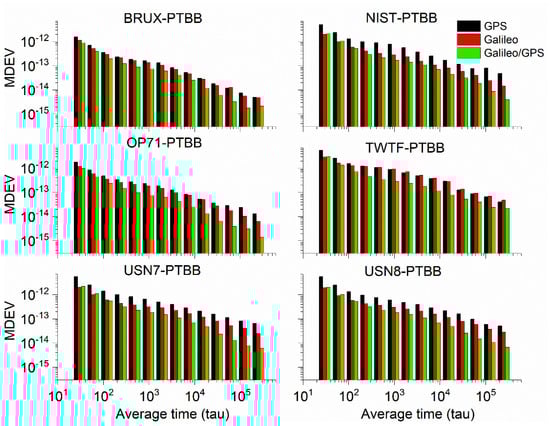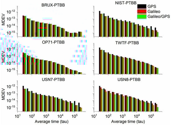 The MDEV of GPS (G), Galileo (E), and Galileo/GPS (E/G) PPP in the static model at 960 s and 15,360 s for six time links.