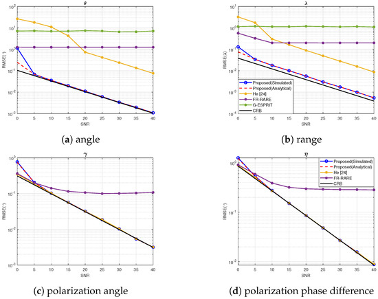 Simulation experiments were performed to evaluate the performance of the proposed method compared with the existing G-ESPRIT method [22], FR-RARE method [23], He’s method [24], and the CRB [24] for an exact NF polarization scenario.