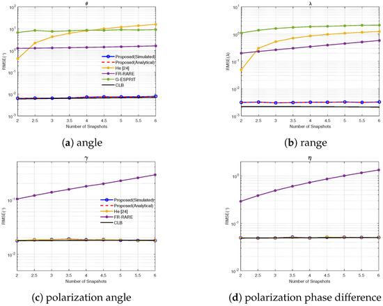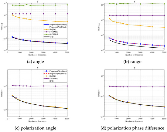 In this experiment, we evaluated the performance by varying the number of snapshots from 400 to 5000, the SNR was fixed as 25 dB, with the same source parameters as in Experiment 1. The RMSE of the 4-D parameters vs. the number of snapshots is shown in Figure 7. The results demonstrate that the RMSE of both the proposed algorithm and He’s method decreased with increasing snapshots, while our method had a better performance. In contrast, G-ESPRIT and FR-RARE were always in a performance saturation state.