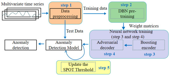 The proposed deep belief network-based boosting adversarial autoencoder, termed DBN-BAAE, is a novel lightweight anomaly detection mechanism for ICSs based on a boosting adversarial autoencoder, as shown in Figure 1. It consists of five main steps, with the dashed line highlighting the innovations of this work. Unlike typical anomaly detection methods, this work introduces a DBN pre-training step before neural network training to enhance algorithm stability. Additionally, a two-stage training process with a boosting encoder and adversarial decoder is proposed, simplifying the structure and improving detection accuracy. Finally, during the anomaly detection phase, the Streaming Peaks Over Threshold (SPOT) [39] threshold is dynamically updated based on the test data, enhancing adaptability.