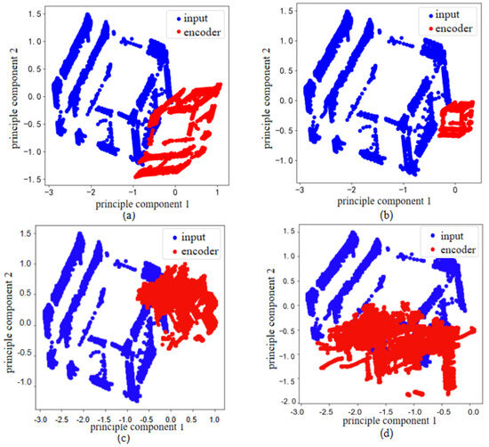 To highlight the importance of enhanced DBN pre-training, we compare autoencoders with and without DBN pre-training. Using the dataset from the last day, we visualize the data after applying Principal Component Analysis (PCA) [45] to extract two principal components during autoencoder training, shown in 2D plots in Figure 2. The blue points represent the input data projections, and the red points represent the feature projections learned by the autoencoder.