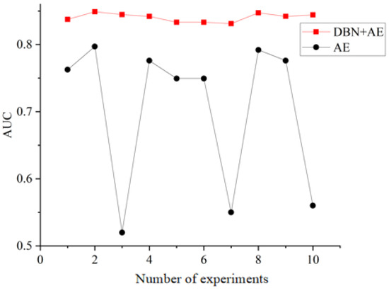 To assess the impact of the extracted features on anomaly detection, we compare the AUC scores of autoencoders with and without DBN pre-training, as shown in Figure 3. In Figure 3, the AE-only model experiences sharp AUC declines to around 0.50 in experiments 3, 7 and 10. These performance dips arise from the stochastic nature of weight initialization and from certain noise realizations that can trap a single autoencoder in a suboptimal reconstruction result. Consequently, its ability to distinguish normal from anomalous patterns is affected. The pre-trained model exhibits more stable and consistent performance across multiple experiments, demonstrating that enhanced DBN pre-training improves the overall stability of autoencoder training and its effectiveness for downstream anomaly detection.