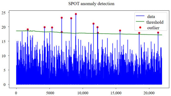 POT defines the extreme value as the probability of a sample exceeding a small value q, with a constant t set at the 98th percentile of the data. Peaks above t but below are considered normal. GPD parameters are estimated using maximum likelihood to determine the threshold for anomaly detection. For real-time detection, the POT algorithm is adapted into the SPOT method, which follows these steps: