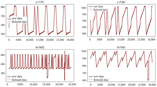 To assess overall reconstruction performance, data from four sensors (LIT101, LIT301, AIT402, and AIT401) were analyzed. Figure 8 visually compares the original data (black) with reconstructed data (red). The reconstruction mechanism effectively captures complex, multi-frequency changes in AIT402 and AIT401 sensors, indicating its effectiveness.