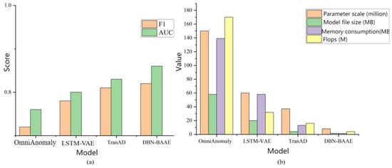 To further evaluate DBN-BAAE’s performance, we compared it with baseline unsupervised algorithms for multivariate time series anomaly detection. Each model was tested three times for stability and the results were averaged. Comparative results are shown in Figure 9a and Table 3. Overall, our proposed mechanism outperforms similar algorithms. Specifically, our mechanism achieves better AUC, recall, precision and F1 scores than the lightweight TranAD model, attributed to enhanced encoder training for improved feature representation. OmniAnomaly performs poorly due to the absence of adversarial training, limiting its ability to detect anomalies close to normal data. LSTM-VAE shows the weakest performance, probably due to inadequate modeling of global data patterns. To validate our mechanism’s reduced resource consumption, we recorded parameters, model file size, memory usage, and floating-point operations per second (FLOPS). Our model consumes the least system resources, as shown in Figure 9b.