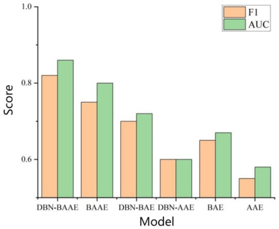 This section proposes a combined mechanism integrating DBN pre-training to enhance the autoencoder and counter the decoder. We assessed each component’s effectiveness through experiments using control variables, with results analyzed in Figure 10. Ablating DBN from DBN-BAAE decreased both AUC and F1, highlighting the importance of a good initialization value. Ablating the adversarial decoder from the DBN-BAAE failed to detect anomalies close to normal. Ablating the enhanced encoder from the DBN-BAAE showed poor performance due to the lack of integrated learning methods to enhance reconstruction ability and reduce reconstruction error. In conclusion, the DBN-BAAE fusion mechanism exhibits superior performance, surpassing all ablation models in AUC and F1 scores.