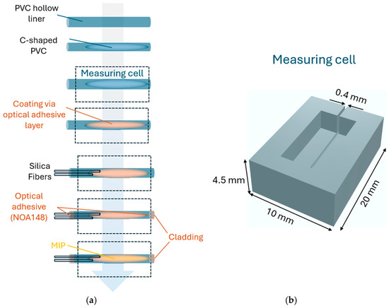 (a) Outline of the fabrication steps of the two-OFs-based sensor. (b) CAD drawing of the measuring cell with related measurements.