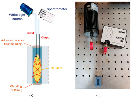 As shown in the outline of Figure 2a, the offset between the fibers in the sensitive waveguide was used to collect the reflection light via the MIP-based waveguide (without collecting the direct light from the end of the input optical fiber). In the optical sensitive waveguide, the UV-cured optical adhesive (NOA148) layers were the cladding, and the MIP was the core of a multimode waveguide.