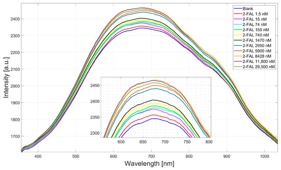 Reflected spectra intensity of the two-OFs-based sensor at different concentrations of 2-FAL solutions in water ranging from 1.5 nM to 29,500 nM.