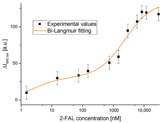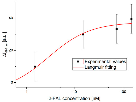 The relationship in Figure 4 can be considered a dose–response curve for the determination of 2-FAL in aqueous solutions, since it represents the difference in intensity between solutions with increasing concentrations of the analyte and that of the blank at = 690 nm. The error bar corresponds to the maximum standard deviation of the sensor system (the worst case) relative to the blank solution, where there is no MIP–analyte interaction, obtained on three similar sensor chips (n = 20), equal to 9 a.u. Therefore, the experimental measurement error for each value is likely less than the reported error bar.