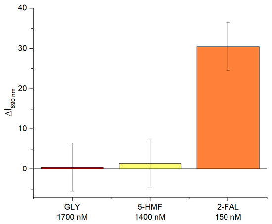 Selectivity test: obtained results by testing the proposed sensor with GLY (1700 nM), 5-HMF (1400 nM), and 2-FAL (150 nM).
