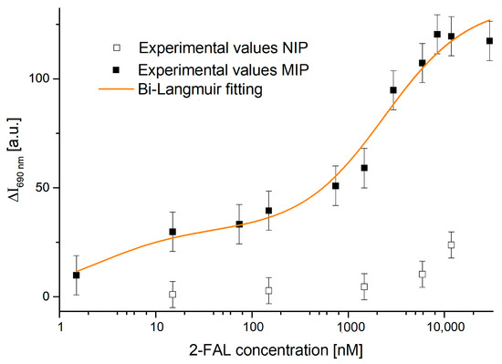 The experimental values corresponding to the intensity variation () caused by solutions with increasing concentrations of analyte versus blank at a fixed wavelength of 690 nm were obtained; since the effect is higher at this wavelength, the measurement should have a higher sensitivity. The results are reported in Figure 4, with the x-axis in a semi-logarithmic form, in order to be able to appreciate the whole considered concentration range. The Bi-Langmuir model was used to fit the experimental values, which assumes that two kinds of specific sites with different affinities for the template are present in this MIP [38]. The relationship is as follows (Equation (1)):
