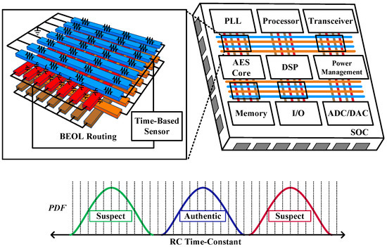 While these papers have proposed various die authentication methods, they pose challenges in seamless integration into other circuits. This is attributed to the necessity for a designated area for PCF circuits, which not only complicates integration but also introduces susceptibility to targeting by attackers. To address this limitation, we propose the use of an in situ time-based sensor that directly measures the RC time-constants of the back-end-of-line (BEOL) metal routing. This sensor can be seamlessly integrated into the functional routing of any system-on-chip (SoC) to provide robust die authentication, as illustrated in Figure 1. To the authors’ best knowledge, this work presents the first in-situ measurement of the RC time-constants of the BEOL metal interconnect.