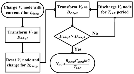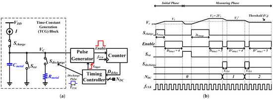 The direct measurement time-based sensor is composed of four main elements, as illustrated in Figure 2a. To begin, a time-constant generation (TCG) block enables an assessment of RC time-constant involving and , which represent the resistor and capacitor of the BEOL metal routing. Subsequently, a pulse generator transforms the voltage stored on from the voltage domain into time domain pulses. Following this, a counter acts as a quantizer in the time domain, gauging the duration of these pulses. Lastly, a timing controller coordinates the functions of these elements, ensuring the proper sequence of operations. The RC time-constant can be derived from the accumulated discharge cycle, denoted as .