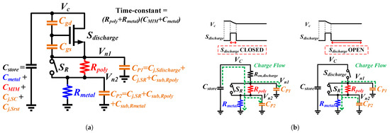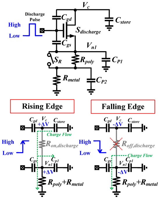 Additionally, to streamline the symbols, , , and the parasitic capacitance of and are combined into a single capacitor, denoted as , which is responsible for storing the charge on the node, as shown in Figure 5a. The ensuing discussion will focus on the effects of and , while the impacts of and of the discharge switch, which results in a clock feedthrough effect, will be covered subsequently.