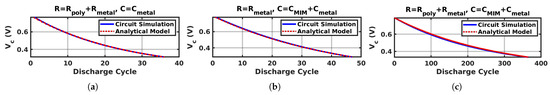 It should be emphasized that while the low-to-high and high-to-low transitions sum a zero effect on node, this is not the case for the node. When the falling edge of the discharge pulse arrives and opens, the discharging path of is disconnected. Hence, the decrease in voltage on the node does not affect and merely accelerates the reset process. To incorporate this clock feedthrough effect into the analytical model, a non-zero initial condition is used for the node when solving the equations. This approach captures the impact of the clock feedthrough effect while preserving the simplicity of the analytical model.