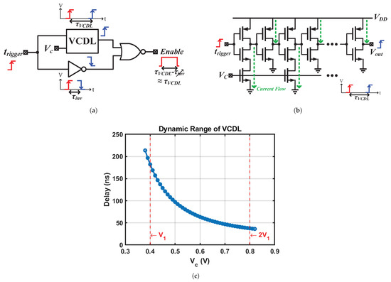 Figure 8b shows the schematic of the VCDL, consisting of 26 current-starved inverters followed by 26 regular inverters in an alternating pattern. By limiting the discharge current via the voltage, the propagation delay of the VCDL can be effectively controlled. The dynamic range of VCDL, covering the voltage range from to , is depicted in Figure 8c and spans from 37 ns to 182 ns.