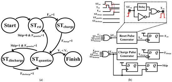 The timing controller coordinates the sequential operations of each block within the system. Illustrated in Figure 10a, the state machine of the timing controller comprises four distinct states: (resetting the node), (charging the node), (quantizing the voltage on the node and comparing it to the threshold voltage), and (discharging the node). Each state is associated with a finished signal, denoted as , where n represents one of the four states. Additionally, there is a signal that determines whether the system is in the discharging phase. After the state machine enters the state twice, the signal is raised, restricting the state machine’s transitions to alternate between the and states.