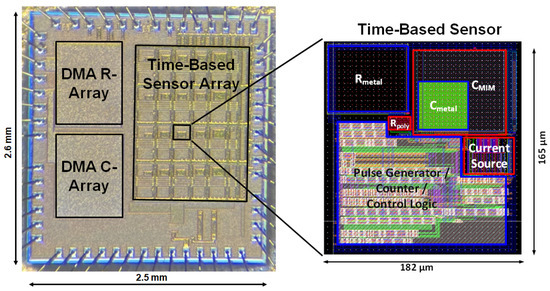 An array of the five time-based sensor variants has been fabricated in a 130 nm CMOS technology with a 1.5 V supply voltage. The die photo, shown in Figure 12, reveals a total area of 2.5 mm × 2.6 mm, accommodating 81 DMA-resistance cells, 108 DMA-capacitance cells, and 20 time-based sensors.