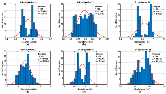 Measured results from the first wafer, encompassing four chips, are presented in Figure 13a,c,e. The displayed bimodal shape of the histogram is attributed to die-to-die variation and the small sample size. As the sample size increases, it is expected that the distribution would converge toward a Gaussian distribution. Similarly, results from the second wafer, involving seven chips, are plotted in Figure 13b,d,f. Notably, the second wafer’s three resistance cell mean values consistently exhibit a 10% elevation compared to those of the first wafer, likely due to process variation. When compared to circuit simulations in the typical-typical (TT) corner, the mean values of the measured results across two wafers are approximately 22% higher for all three resistor cells, as summarized in Table 4. This discrepancy may be attributed to the difference between models and real manufacturing process as well as process variations. This discrepancy highlights the critical need for the DMA measurements, as simulation results alone are insufficient.
