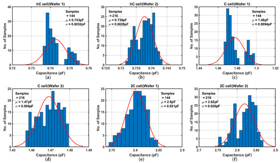 The voltage sources and are provided by Keithley-2400 unit set at 1.5 V and 0 V, respectively. Since half of the clock period is 25 ns, significantly larger than the delay of the inverter chain, the measured error due to the shortened charging period is negligible. Figure 14 presents the measured results separately for each wafer. Due to die-to-die variation and a small sample size, the histograms deviate from a Gaussian distribution. Notably, unlike the resistor array, the mean values across the three capacitor cells from both wafers are notably similar. When compared to circuit simulations in the TT corner, the mean values of the measured results closely match, with a maximum error of 2.5%. These results are summarized in Table 5.