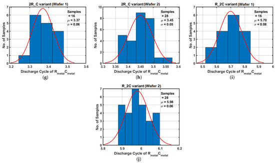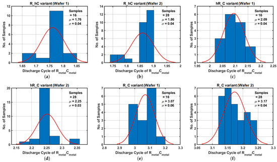 The distribution of the derived discharge cycles for is shown in Figure 15, with separate data for each wafer. Notably, the discharge cycles of the second wafer consistently exceed those of the first wafer, aligning with the DMA resistor array results. Similar to the histograms shown for the DMA, as the sample size increases, the distribution is expected to converge toward a Gaussian distribution.
