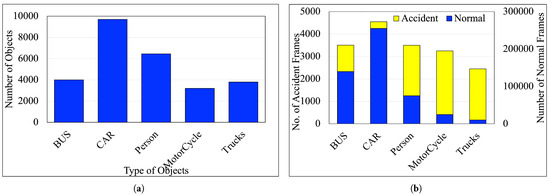 Figure 2b illustrates the distribution of several accidents and regular frames in the dataset across six categories: Bus, Car, Person, MotorCycle, and Trucks, where the y-axis represents the number of frames, while the x-axis denotes the object categories. We have collected around 210 videos of road accidents varying around 24–30 FPS through these steps, with 17,255 accident frames and 505,245 regular frames.