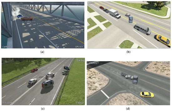 BeamNG.drive is a sophisticated vehicle simulation game recognized for its realistic soft-body physics and intricate vehicle dynamics. Created by BeamNG GmbH, this simulator offers an open-world environment where players can drive, crash, and customize a variety of vehicles across different scenarios. Unlike conventional racing or driving games, BeamNG.drive prioritizes realism, making it a favored choice among automotive enthusiasts, game modders, and researchers exploring vehicle dynamics and crash scenarios. Figure 3a–d show some of the frames from videos generated using the BeamNG.drive simulator from the TU-DAT dataset. Its key features include the following: