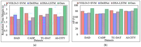 We calculate the Average Precision (AP) from precision and recall pairs to evaluate the accuracy of our C-FAR framework. In Figure 4a, the x-axis represents datasets, and the y-axis represents the Resolution Time Margin (RTM), which is the time required to anticipate each type of anomaly in seconds, showing that C-FAR performs best on the DAD dataset with optimal AP and RTM. As seen in Figure 4a, our model anticipates accidents 3.42 s earlier with an AP of 89.27%, outperforming three other methods. The YOLOv3 + SVM method struggles with parameter setting and orientation issues, while the DSA + LSTM model is resource-intensive and inefficient. Comparing C-FAR with DriftNet, we find that C-FAR captures a broader range of driving behaviors (e.g., speeding, weaving) and achieves 95% accuracy, surpassing DriftNet’s 92.5%. Generally, C-FAR performs significantly better than all other models and on all the datasets.