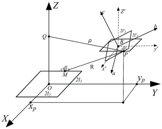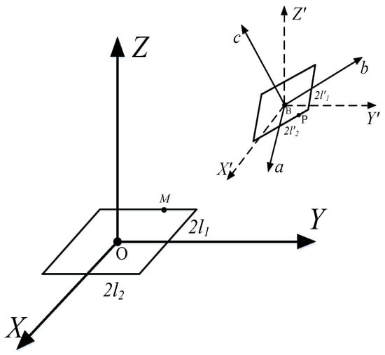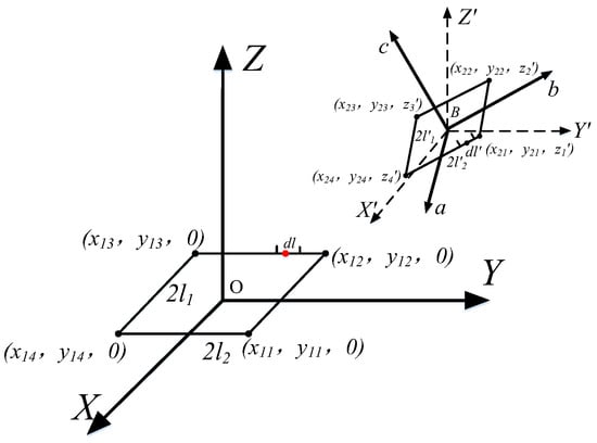 This paper primarily investigates the mutual inductance between arbitrarily positioned rectangular coils, as illustrated in Figure 2. The side lengths of the primary coil and secondary coil are denoted as 2l1, 2l2 and 2l’1, 2l’2, respectively. A Cartesian coordinate system (O-XYZ) is established with the center O of the primary coil as the origin, and the rectangular plane is situated on the XOY plane. Similarly, a body-fixed coordinate system (B-X’Y’Z’) is established with the center B of the secondary coil.