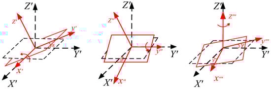 As illustrated in Figure 3, the rotation angle is defined by the Euler angles around the X’-, Y’-, and Z’-axes, which are, respectively, denoted as α, β, and γ. The total rotation is divided into three steps: rotation around the X’-axis by α, rotation around the Y’-axis by β, and rotation around the Z’-axis by γ.