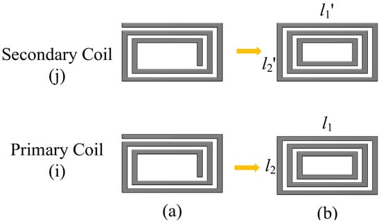As illustrated in Figure 7, the mutual inductance of a multi-turn rectangular spiral coil is calculated by simplifying the planar spiral coil. The rectangular spiral coil (Figure 7a) is approximately modeled as several concentric single-turn rectangular coils (Figure 7b). Ultimately, the following formula for calculating the mutual inductance (Mt) of the rectangular spiral coil is derived using the principle of superposition: