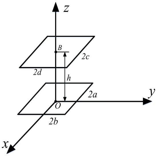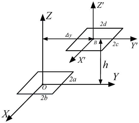 As illustrated in Figure 8, the two rectangular coils are arranged in parallel and are coaxial, with a vertical separation of h between them. The length and width of the primary coil are designated as l1 = a and l2 = b, while the length and width of the secondary coil are represented as l’1 = c and l’2 = d. The origin of the secondary coil is defined at coordinates xB = yB = 0 and zB = h. The angles of rotation are set to α = β = γ = 0.